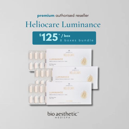 Heliocare Luminance addresses the entire melanogenesis pathway and works from inside out, which is effective for deeper hyperpigmentation that topical products cannot reach.